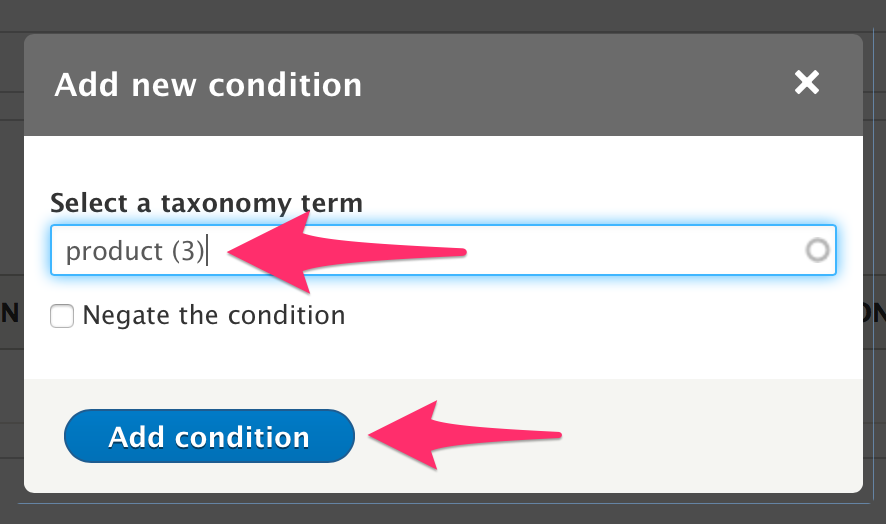 For this example, I’d like to display a basic “Visit our store” block whenever the user views any node tagged with the term “product” in any taxonomy term reference field.