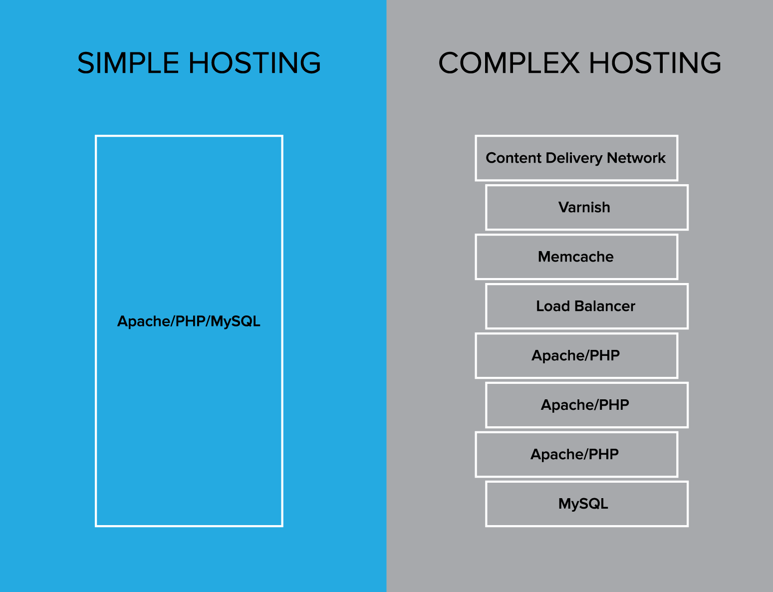 There are different types and levels of Web hosting available today. You could be on a very simple plan where everything is on one box (left), or you could have very complex hosting with a database server separated from several Web servers (right). Those servers could be sitting behind a load balancer and Varnish. You could also be using a CDN (content delivery network).